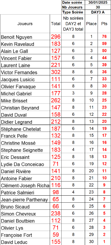 Résultat du Day 3A du 30 Janvier 2025 et du DAY 4A du 04 février 2025