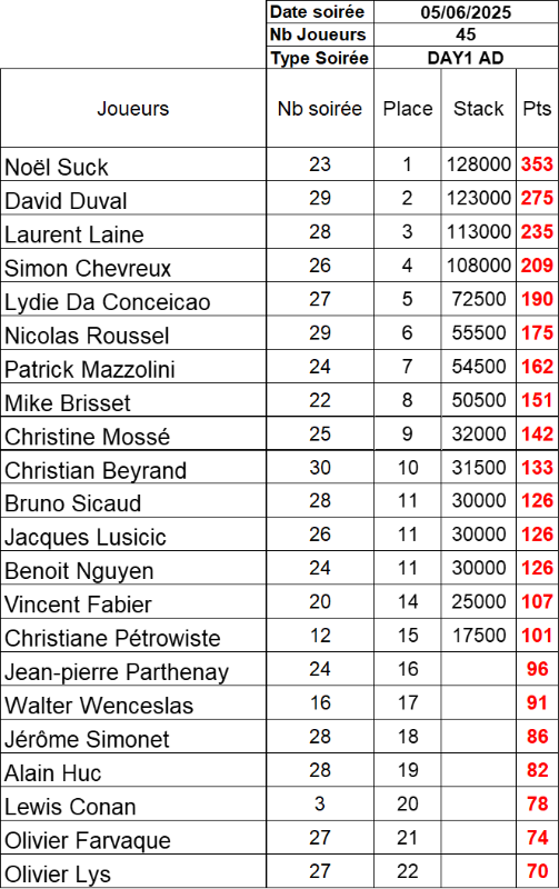 Résultat du Day 1AD du 05 Juin 2025