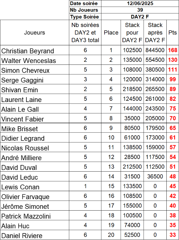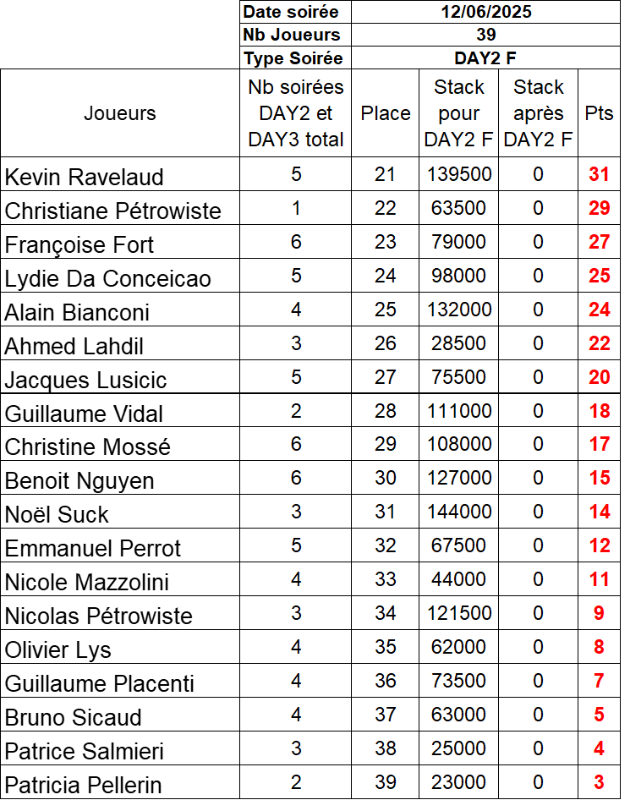 Résultat du Day 2F du 12 Juin 2025