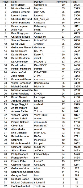 Classement Général saison 2024-2025 Vaux Océan Poker