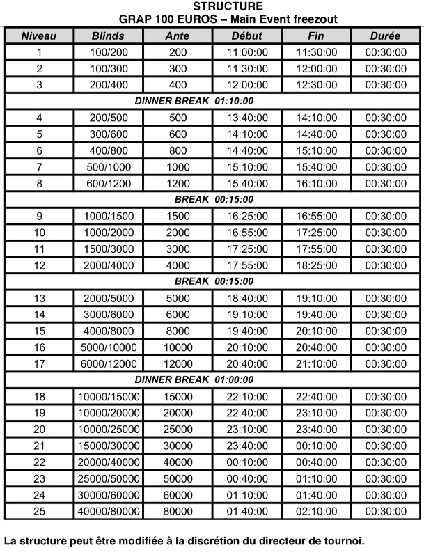 Le tournoi de qualification pour le CRIC se déroulera en formule MTT Full Ring suivant structure de nos soirées, le